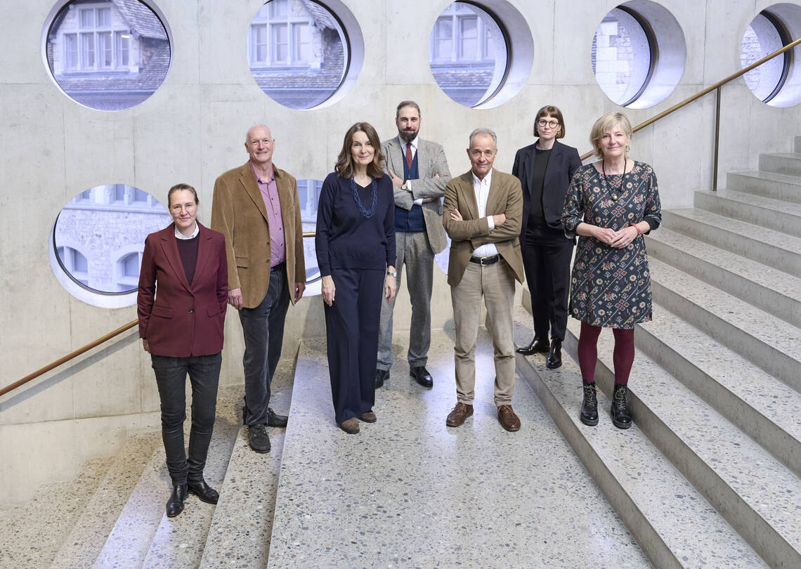 v.l.n.r.: Larissa Bieler* (Vize-Präsidentin, Direktorin SWI Swissinfo.ch, SRG SSR, Bern und Mitglied der Geschäftsleitung der SRG SSR, Bern), Theo Mäusli (Mitglied, Ehemaliger Projektleiter und Experte für Innovation und Angebot SRG SSR; Dozent für Mediengeschichte FernUni Schweiz und digitale Archive und Rundfunkgeschichte USI), Laura Sadis* (Mitglied, ehemalige Politikerin, Ökonomin, tätig im Non-Profit-Sektor), Roberto Zaugg (Mitglied, Professor für Geschichte der Frühen Neuzeit an der Universität Zürich), Tim Guldimann (Präsident, Politikwissenschaftler, Diplomat und Politiker), Vanessa Rüegger* (Mitglied, ordentliche Professorin für Öffentliches Recht an der Universität Genf), Marie-France Meylan Krause (Mitglied, Archäologin und ehemalige Direktorin Site et Musée romains d’Avenches), nicht im Bild: Andreane Jordan Meier (Mitglied, Anwältin und Direktorin für Entwicklung und externe Angelegenheiten beim Centre hospitalier universitaire vaudois in Lausanne)