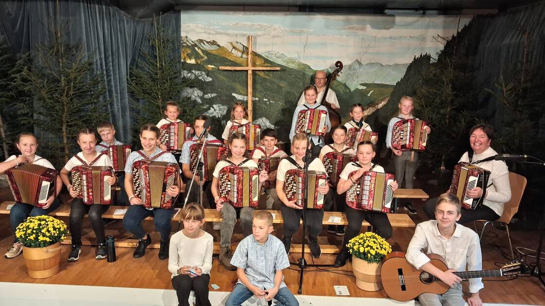 Junge Volksmusikantinnen und Volksmusikanten aus Muotathal, Brunnen, Schwyz und Immensee musizieren unter der Leitung von Jolanda Schmidig auf der Stubete-Bühne in der Ausstellung Volksmusik.